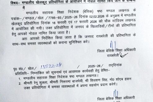 मंडलीय सहायक शिक्षा निदेशक बेसिक मंडल लखनऊ के निर्देश के क्रम में मंडलीय खेल कूद प्रतियोगिता लखनऊ के चौक स्टेडियम में दिनांक 16 फरवरी एवं 17 फरवरी 2026 को आयोजित की गई है। जनपद रायबरेली की टीम को प्रतिभाग कराने के लिए जिला बेसिक शिक्षा अधिकारी राहुल सिंह द्वारा खण्ड शिक्षा अधिकारी क्रमशः डॉ सत्य प्रकाश यादव विकास खंड रोहनिया एवं बृजलाल विकास खंड राही को नोडल नामित किया गया है।